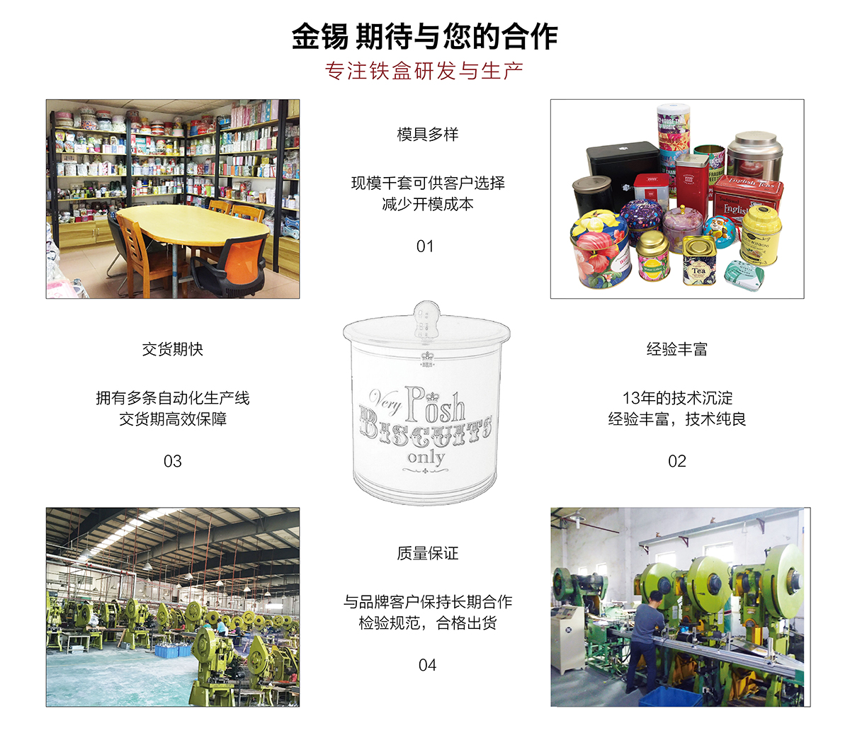 廣州市金錫五金制品有限公司成立于2016年,是已有13年生產(chǎn)經(jīng)驗的實力廠家。我廠是專業(yè)定制優(yōu)良馬口鐵盒、鐵罐、禮品盒、茶葉罐、月餅盒等金屬鐵盒包裝的制罐企業(yè),我們擁有超過6000平方米的標(biāo)準(zhǔn)現(xiàn)代化廠房及八條生產(chǎn)線。公司集產(chǎn)品研發(fā)、設(shè)計、生產(chǎn)、銷售于一體,技術(shù)優(yōu)良,實力雄厚。通過十多年的制罐經(jīng)驗,我們擁有專業(yè)的技術(shù)團(tuán)隊,嚴(yán)格的作業(yè)流程、完整的品質(zhì)保障體系、完善的銷售以及售后服務(wù)系統(tǒng)。
